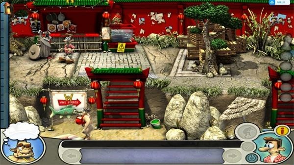 1、从左上鸭笼中取出鸭蛋放入右下的乒乓球台;场景32、趁厨师取下眼镜时将其偷走,从右上的箱子中取出自行车内胎并放入左上装鳗鱼的桶中;
