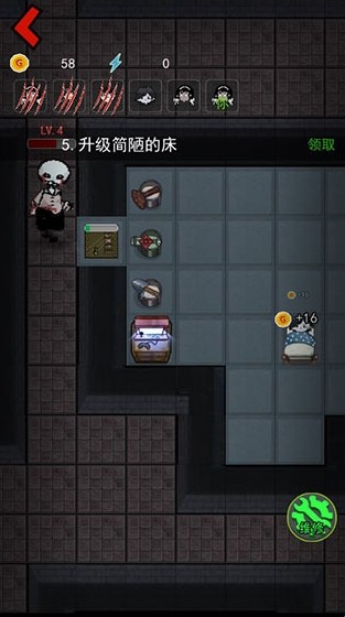 5、在睡觉的时候玩家们可产生金币,通过金币玩家们可升级门、床、以及装备武器;