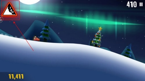 3、屏幕左侧上方的雪崩警示牌会在雪堆即将接近时不断地闪烁以示警告,即时你已经在视野中能够看到背后奔腾而来的大雪,如果此时爬起继续滑行,那么甩掉这近在咫尺的雪堆也并非不可能。