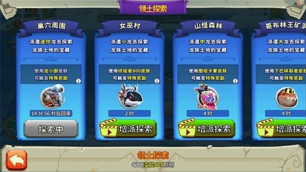 3、选择完毕后,所选的龙即开始探索,探索中的龙无法在游戏中使用。探索队最多两条龙,其中第二条龙需要观看激励视频才可增派。