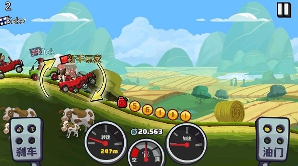 游戏的操作方式是非常的简单的,屏幕右下角的虚拟按键是油门,可以通过按压程度的不同,来给车子进行加速;屏幕左下方角的虚拟按键是刹车,可以对车子进行减速。这个按键还有一个非常大的功能,就是在我们的车子快要翻车的时候,松开油门,点击刹车,就可以矫正我们的车子,使车子不会翻。