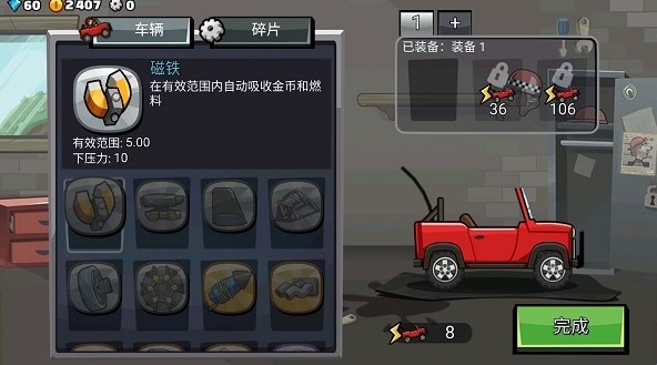 在部件系统里,可以对汽车增加一些新的部件,增加汽车的性能。在新手阶段,我比较推荐带重型、磁石、着陆助推力三种部件。重型,可以增加赛车的重量,降低赛车的重心,使赛车在行驶时能够更加的平稳。磁石,可以收集燃料和半径更宽的金币,可以更快的积累足够的金币来对赛车进行改造升级。着陆助推器,可以在赛车跳跃落地以后,获得一段冲刺,拉开与其他赛车的距离,获得更高的评价。