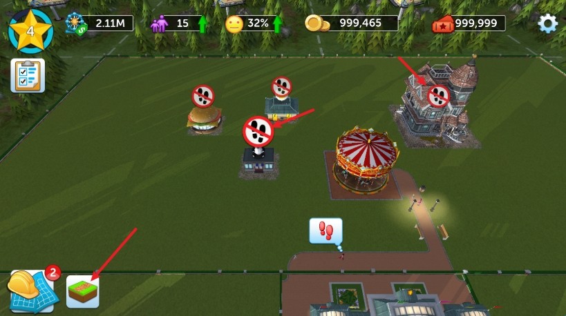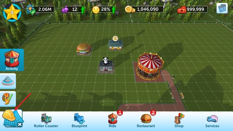 1、游戏中我们需要一步步修建起游乐场,首先点击左下角进行建设。