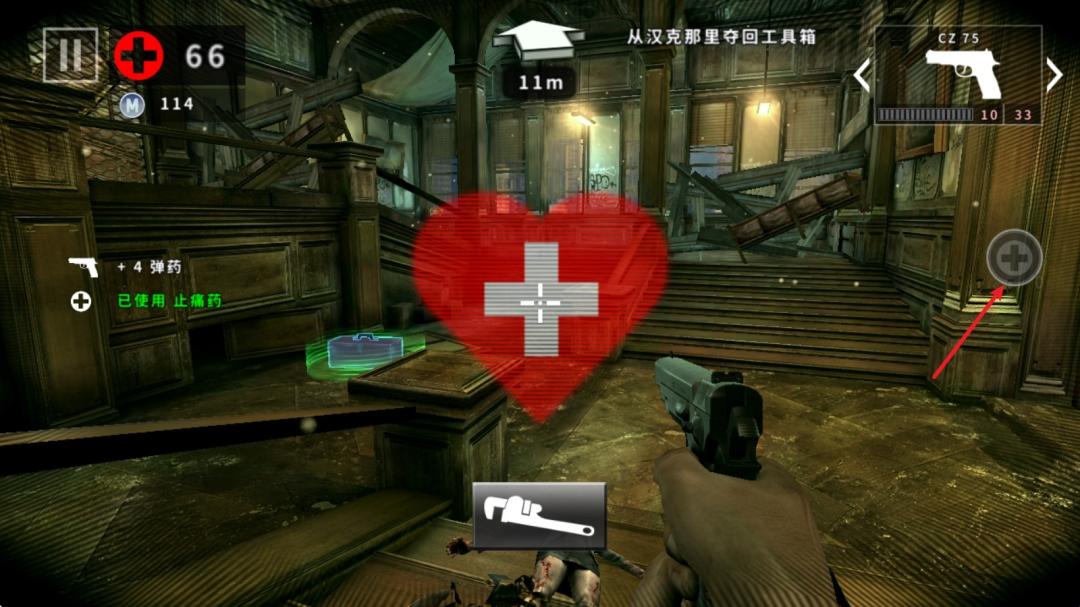 7、右侧的十字按钮时是医疗道具,血量不足的时候可以为你恢复血量。