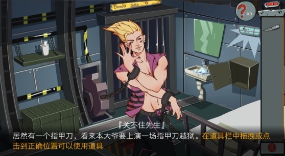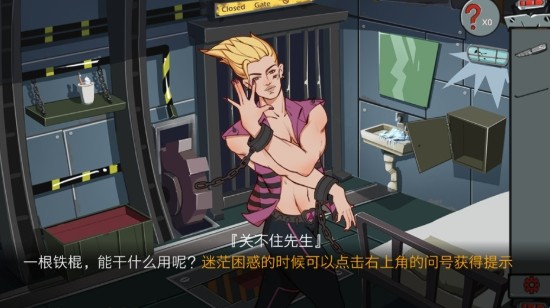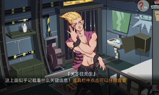 在这个监狱密室内,你因被警方逮捕而被关进了监狱当中,为了逃出这里,你需要在场景内搜索道具,解开手脚上的铁链挣脱牢笼即可成功!关不住先生游戏增设了各种谜题任务,你需要逐一破解,且不能被警方发现,这样才能成功逃出去!
