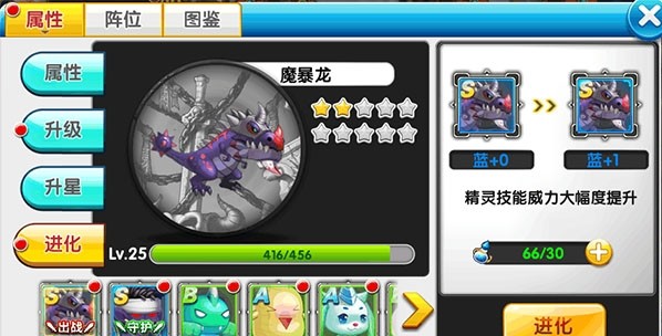 获得的同时也会有经验蛋糕的(给精灵涨经验的东东),到精灵的功能界面给你的“恶鬼同学”升升级吧。然后在祭坛中在用免费给的祭坛扭蛋抽一次,你会必定获得10个恶鬼精灵的碎片,拿着这些碎片能够给恶鬼精灵在生星。