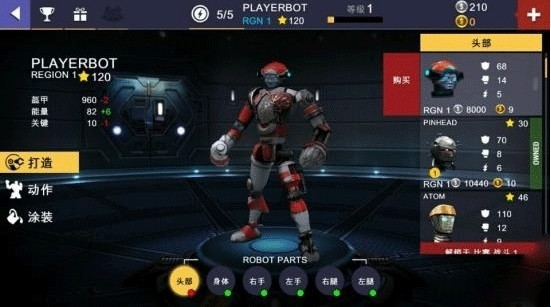 6、编辑机器人则是外在的升级,看上去就很厉害的升级,也是小编最喜欢的升级方式。打造、动作和涂装三大类。打造主要是机器人不同部位的机甲升级;动作则让你的机器人在比赛中动作更炫酷,更具观赏性;而涂装则是将机器人喷涂成不同的颜色,更帅气。