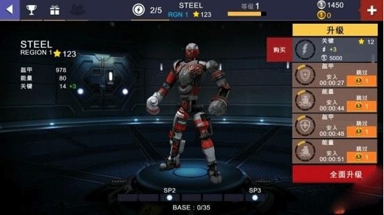 5、小编要特别给各位玩家介绍一下游戏神奇的升级系统。《铁甲钢拳冠军赛》有两套升级系统,一套叫升级,一套叫编辑机器人。机器人毕竟是个机器,第一个升级主要是升级机器人的软件设备,增加机器人的盔甲、能量和关键,提高机器人灵活性、力量和耐力。