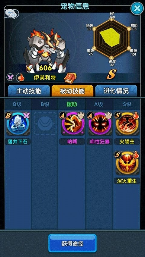4、游戏中的宠物可以通过特定的材料进行进化,不但外观会变得更加酷炫,还有机会解锁新的技能。