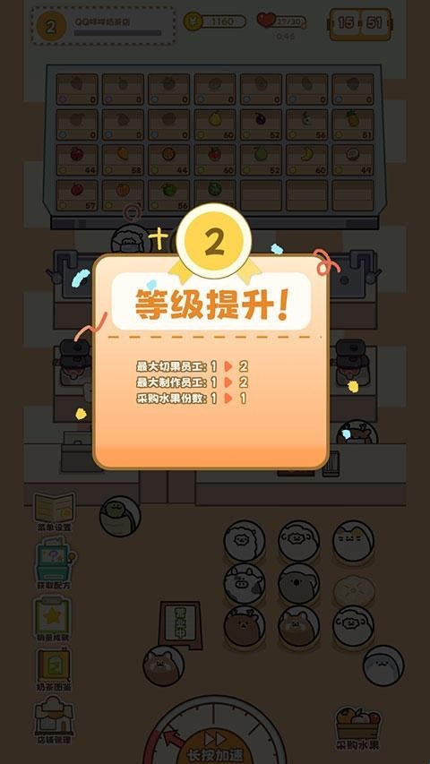 8、随着经营活动的进行,我们的奶茶店也会获得【升级】,升级可以解锁更多营业员工位和水果采购数。