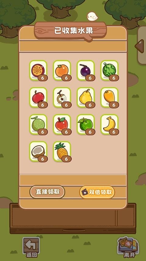 7、全部消除完毕即可获得全部的水果,我们也可以点击右下角的【离开】按钮随时结束收集小游戏。