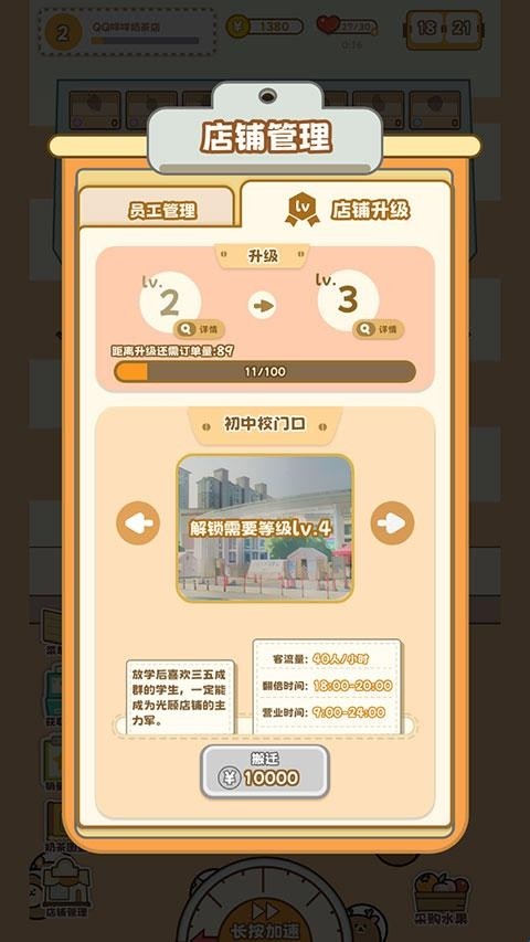 9、当奶茶店提升到一定的等级,还可以在【店铺管理】菜单中对店铺进行搬迁和升级,以获得更多收益。