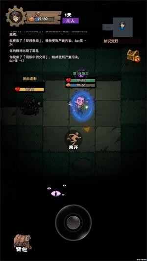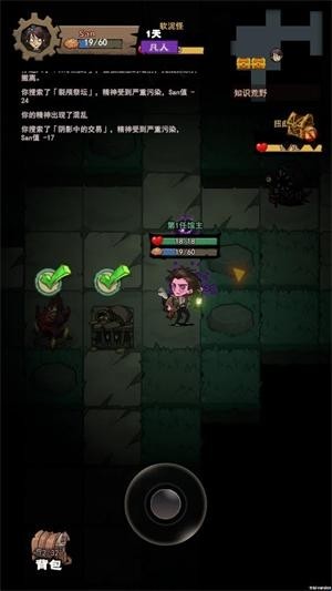 3、进入地图后移动摇杆控制角色移动,点击探索可以消耗san值来进行搜索。