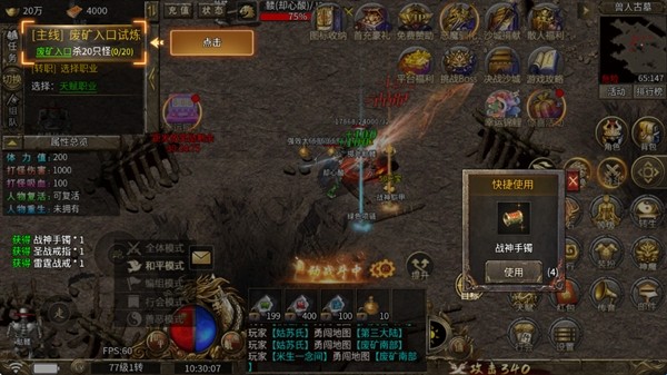 上线之后先跟随主线任务,把盟重省的几个副本都刷一遍。怪物血量低爆率高,新手装备也能快速刷完。刷完之后身上已经换上了一身装备,多余的装备用背包里的回收功能回收为元宝。