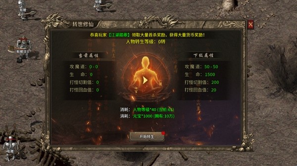 消耗元宝提升人物的转生等级和天罡地煞等级,元宝不需要省,直接升到当前能提升的最大等级。不用担心元宝不够,装备回收会给很多元宝,各种福利活动也都会送元宝。