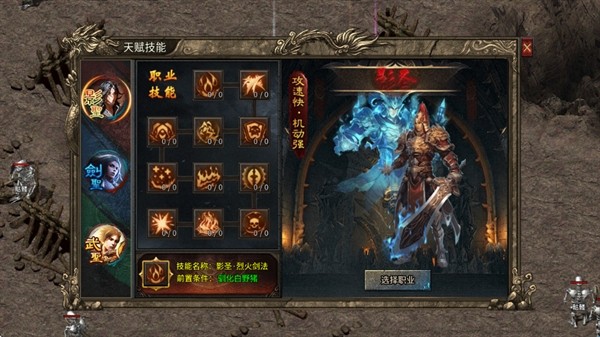 三个职业天赋影圣、剑圣、武圣,分别为高攻速、高伤害、高吸血。选择自己喜欢的天赋就行。后期可以用天赋重置令切换为其他天赋,可以放心的选。