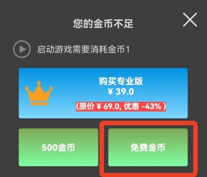 9、启动游戏需要1金币,我们点【免费金币】看个广告,看完广告再点击就能启动了。