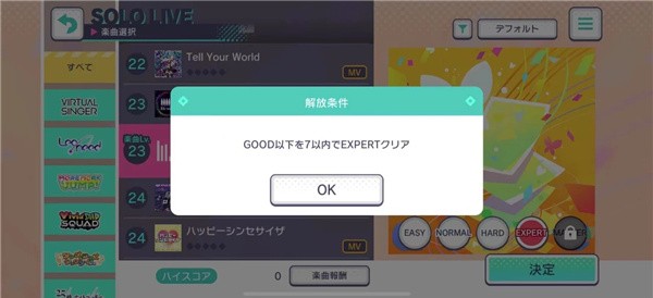 4、这5个难度模式前4个都是可以直接选择的,一开始第5个噩梦模式是处于锁定状态的。它需要玩家完成指定的任务才能开启,在专家模式内该歌曲的good次数少于7次,只有满足了这个条件,噩梦级别的难度模式才能让玩家参与,不然它会一直处于锁定状态的。