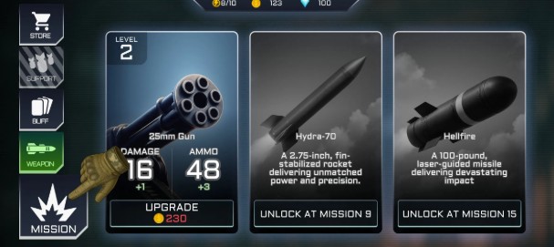 2、强大的武器库:为你的无人机配备速射机枪、火箭弹和制导导弹。解锁升级,定制你的装备,以适应你的游戏风格。