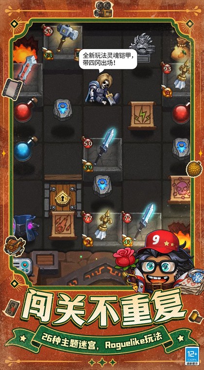 核心迷宫探索玩法:采用经典Roguelike玩法,玩家操控冈布奥深入随机生成的迷宫,通过翻地砖触发怪物战斗、随机事件与道具获取,目标是抵达迷宫深层、解锁更多内容;操作简洁,以点击为核心,同时需要合理利用冈布奥技能、道具与陷阱,应对不同的迷宫危机,兼顾休闲感与策略性。