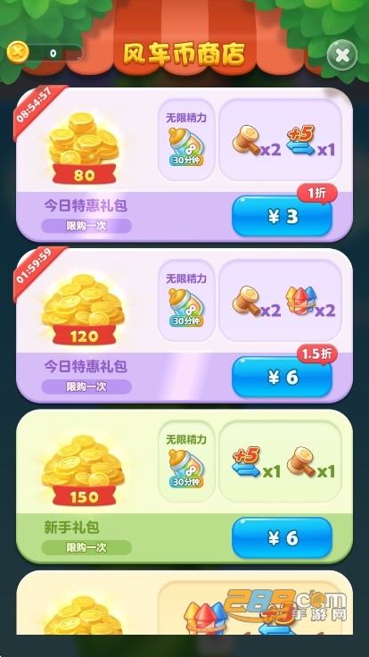 精力与道具辅助玩法:每局游戏消耗5点精力值,系统赠送的精力值耗尽后可等待恢复或接收好友赠送;同时设有小木锤、魔法棒、增加5步等道具,可帮助玩家消除障碍、弥补通关差一步的遗憾,部分道具可通过银币或风车币购买。
