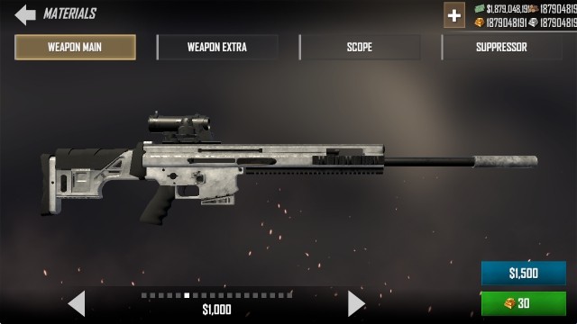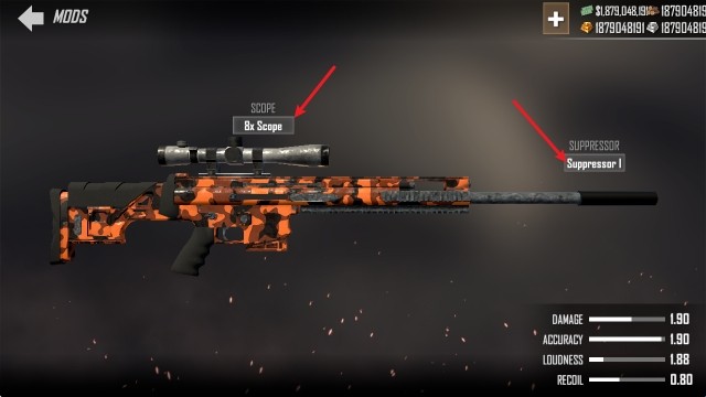 2、进入武器详情后,点击MODS,可以看到狙击镜和枪管可以进行改装。