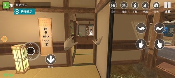 3、左右手指手势,可以操作左右手,拿起物品,比如拿起香皂,抓起马缰绳骑马,当物品出现下方图标提示时,就可以拿起物品或操作物品了;