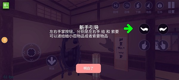 2、左右手账按钮,分别是左右手,给和索要,可以递给小忍物品或者索要物品;